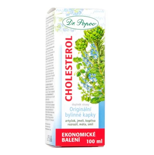 Převezměte kontrolu nad svým cholesterolem – přirozeně! Originální bylinné kapky Dr. Popova Cholesterol v sobě spojují tradičně užívané byliny, jednou ze základních je jmelí. Tu jsme vybrali hlavně proto, že podporuje zdravou hladinu lipidů v krvi a přispívá k metabolismu tuků (cholesterol). Jmelí má antioxidační účinky a podílí se na správném fungování cévní soustavy. Artyčok udržuje hladinu krevních tuků v rovnováze a játra díky němu pracují tak, jak mají. Pýr a pampeliška podporují zdravé trávení, pampeliška navíc udržuje správné fungování žaludku a jater, napomáhá vylučování a působí antioxidačně. Máta se podílí na zdravé činnosti trávicí soustavy a fungování střev. Pampeliška, pýr a máta = Komplexní podpora pro vaše trávení a játra.